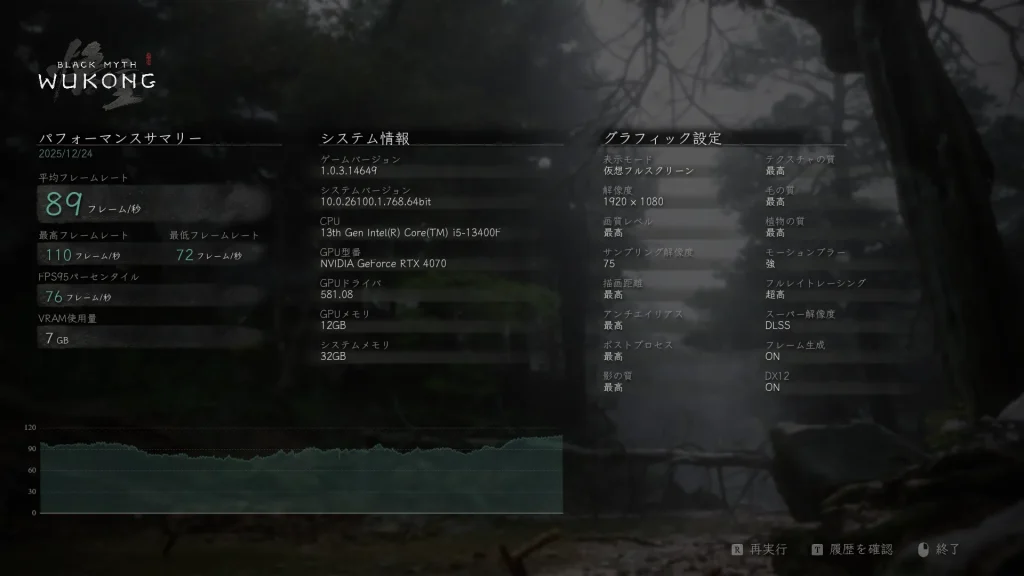 私のPCだと「平均89fps」の判定となりました。最高設定+フルレイトレON+フレーム生成でこれくらいなので意外とがんばってる!