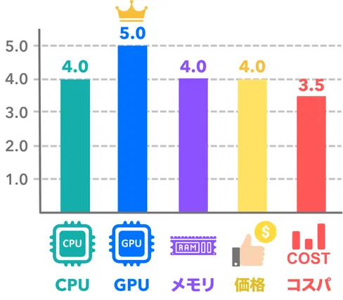 本機種は、CPU「Intel Core i5-14400F」とGPU「RTX 5060」を搭載したモデル。GPU性能は2位の「GK-144FB56Ti8」(209,800円)よりもやや劣りますが、チラズアート作品を含め、さまざまなゲームを快適にプレイできるポテンシャルを持っています。