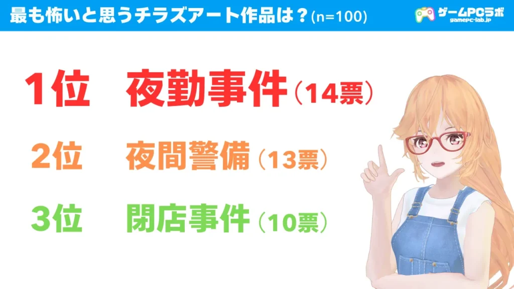 今回ゲームPCラボは100人に対して「チラズアートでもっとも怖い作品」についてのアンケートを実施しました。