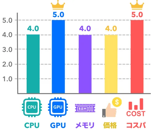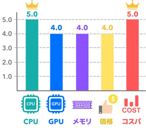 全体的な性能は1位の「Lightning-G AV7RB」よりも劣りますが、こちらはその分価格が安いのと、ストレージが標準で1TB搭載されているのが魅力! また、性能は劣るとは言ったもののこちらもGPUには「RX 9060 XT 16GB」を搭載しているので、ゲーム用途としては十分すぎる性能です。