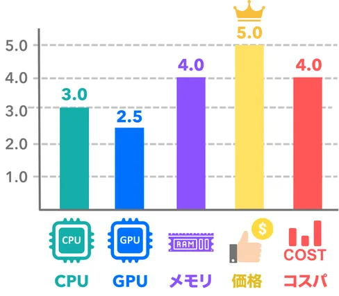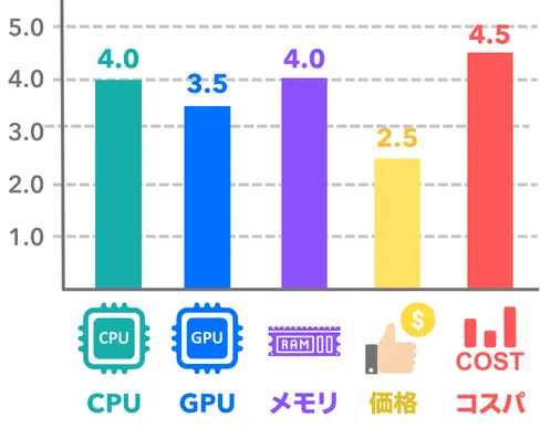 | 順位 | 製品名 | 購入リンク | 参考価格(税込) | CPU | グラフィック | メモリ | ストレージ | CPUクーラー | カスタマイズ |
