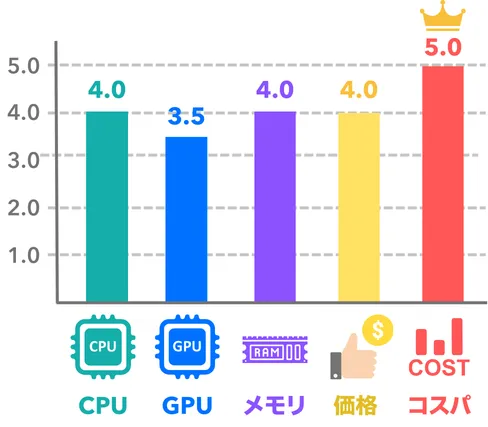 単純に性能を底上げしたようなモデルで、一般的なフルHDモニターで遊ぶ分にはほとんど困ることがないようなスペックに仕上がっています。さらに整えるならメモリを16GB→32GBに増設カスタマイズするのもおすすめですが、今はメモリ価格が高騰しているのでこのまま使うのももちろんOK。はじめてのゲーミングPCとしては申し分ないです。