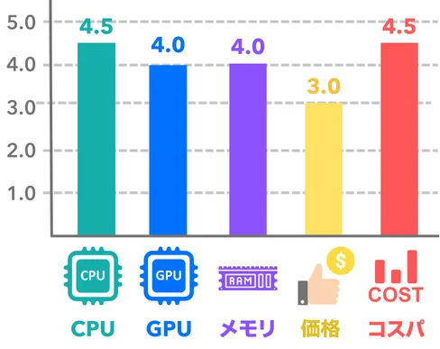 もっと金額が高くもっと性能の良いモデルもありますが、このあたりからCPUとGPUのバランスにも好みが出てくるラインでもあります。一般的なゲーマー向けのPCということであれば、これくらいの金額を上限に留めておくのが無難です。