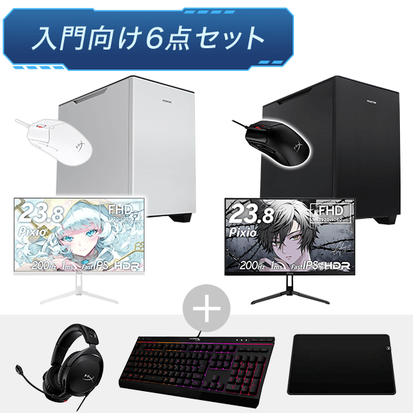 そんな本モデルの強みは、ゲーミングに特化した周辺機器一式がセットになっている点です。PC本体に加えて、キーボード、マウス、マウスパッド、ヘッドセット、液晶ディスプレイが同梱されているため、届いたその日からPCゲームを始められます。