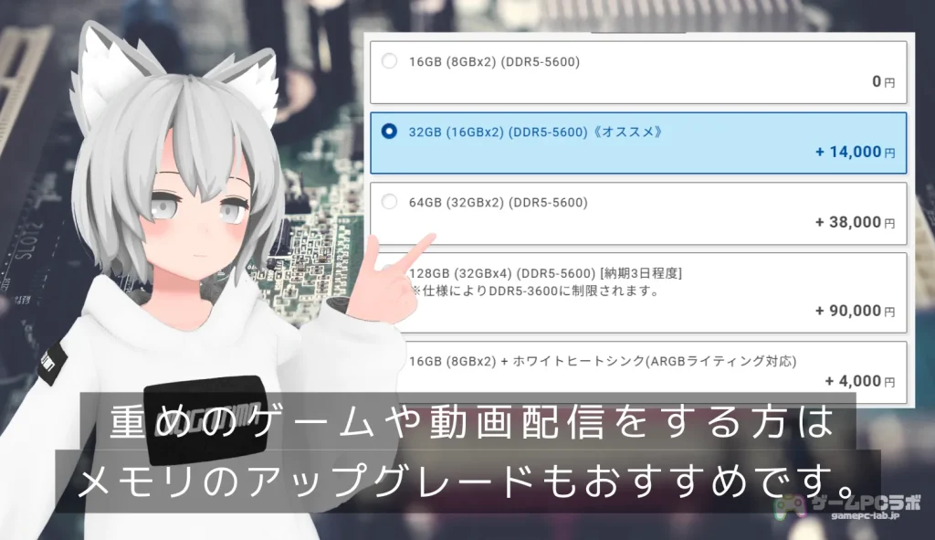 さまざまなゲームをプレイしたり、配信を行ったりする場合は、メモリを16GBから32GBに拡張(+14,000円)しておいて損はありません。