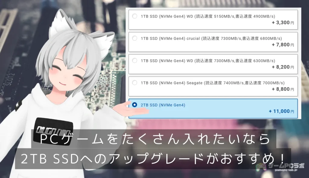 ストレージについては、大量のPCゲームをインストールしたり、購入後すぐに大量のデータを保存したりする予定がある場合は、大容量の2TB SSD(+11,000円)にするのもひとつの手です。