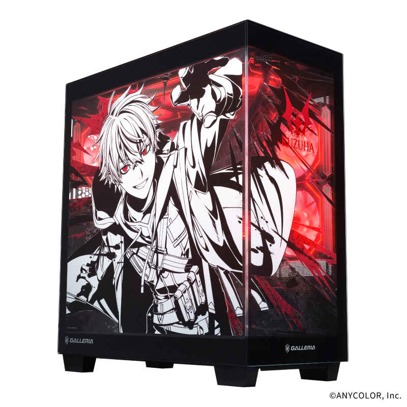 葛葉コラボモデルPCでは、そのクリアガラスパネル一面に本田ロアロ氏による描き下ろしイラストが描かれています。葛葉さんのイメージカラーである白・黒・赤を基調とし、マンガのようなタッチのイラストが特徴的です。PC内部のLEDライトが赤く点灯することで、イラストに躍動感が加わり、まるで葛葉さんがそこにいるかのような存在感を生み出しているのも、大きな魅力です。