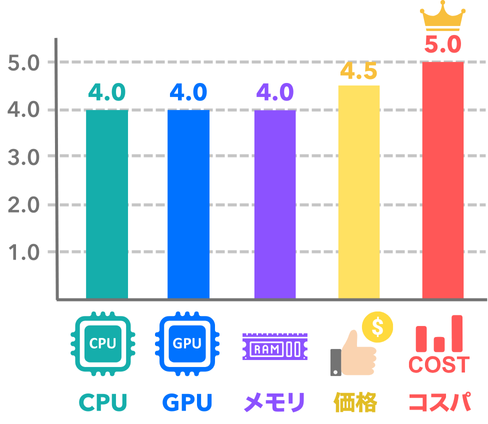 コスパも良いモデルですが、性能が良いぶん金額は20万円超え。他のモデルと比べると少しお高めです。PC単体のコスパなら非常に高いですが、NIKKEのためのゲーミングPCとして考えると少しコスパは落ちるので評価は★4、おすすめ順位も3位となりました。