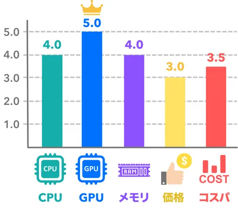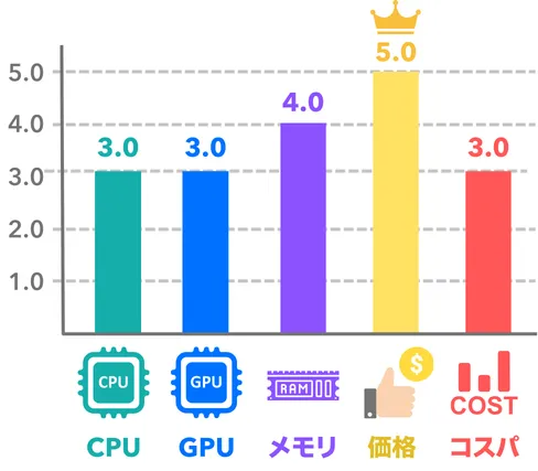 CPU・GPUの性能で見ると文句無しにコスパも高いのですが、メモリが16GBなことと、NIKKEを遊ぶだけならオーバースペック気味なことからコスパ評価は☆3.5としました。
