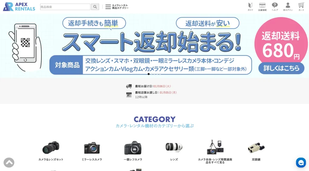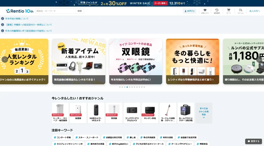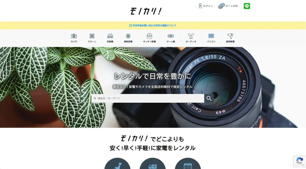 2015年からサービスを展開している、レンタルサービスの最大手です。カメラや家電、ガジェット機器など、多岐にわたる製品を全品往復送料無料で提供しています。