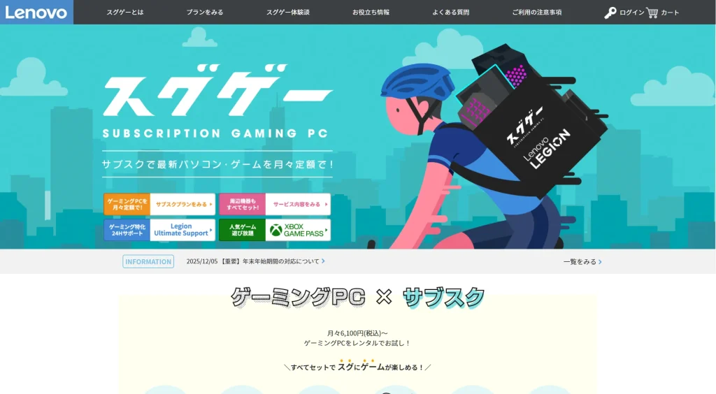 グローバルPCメーカーとしておなじみのレノボが展開するゲーミングPCレンタルサービス「スグゲー」。本サービス最大の魅力は、PC本体に加え、標準で周辺機器、“Xbox Game Pass Ultimate”、24時間365日のサポートがセットになっている点です。