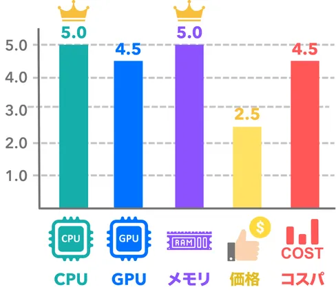 GPUの性能は3位のものよりも劣りますが、こちらはNVIDIA製品なので、DLSS4を利用できるのがメリットのひとつ。他に遊びたいゲームがあって、それがDLSS対応であればこのモデルを選ぶのもアリです。
