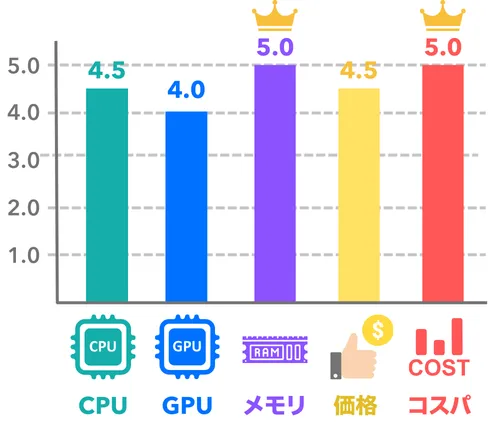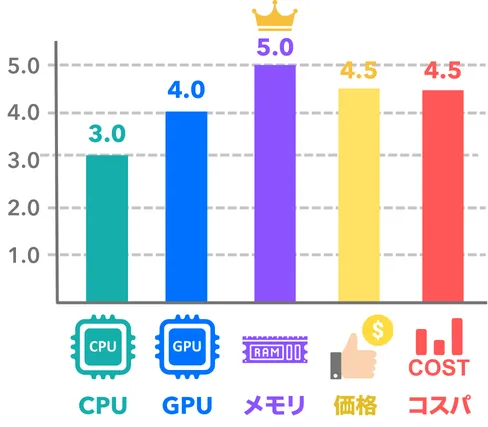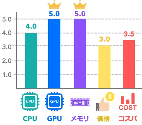 | 順位 | 製品名 | 購入リンク | 参考価格(税込) | CPU | グラフィック | メモリ | ストレージ | CPUクーラー | カスタマイズ |